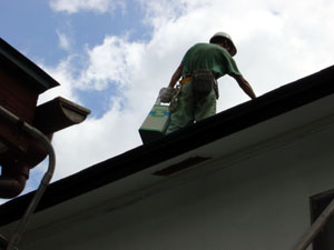 8月27日(水)現調 営業担当者が現調(現場の調査)に来てくれる約束というのに 朝から土砂降りの雨。今日はダメかとあきらめかけていた所、だんだんと小降りになり、約束の10時30分にはすっかりあがって、返って晴れの日より涼しくて現調には最適な天気となった。 時間通りに営業担当者が現れ、早速あちこちデジカメで写真を撮ったり、メジャーで測ったりして、我が家の症状を詳しく調べ始める。 長年放置された外壁も屋根も相当傷んでおり、お願いしているこちらのほうが申し訳なくなってしまう程なのに、「ベランダは一応こうしましょう。でも、別の方法の見積も立ててみますから検討してみてください。」「ここのカビはバイオ洗浄を試してみましょう」「壁際の物の移動もこちらでやりますから大丈夫ですよ。」「換気口は雨などが入らないように出来ますよ」という具合に、塗装以外の部分に関しても具体的な提案をしてくれるので、さすが“プロ”は違うなと感心。 塗装とは関係ないドアノブの修理までちゃっかりお願いしても、気持ちよく引き受けてくれて、いつも社内で上司のモノマネをしている姿とは大違いの頼れる営業ぶりに一安心の私でありました。 | |